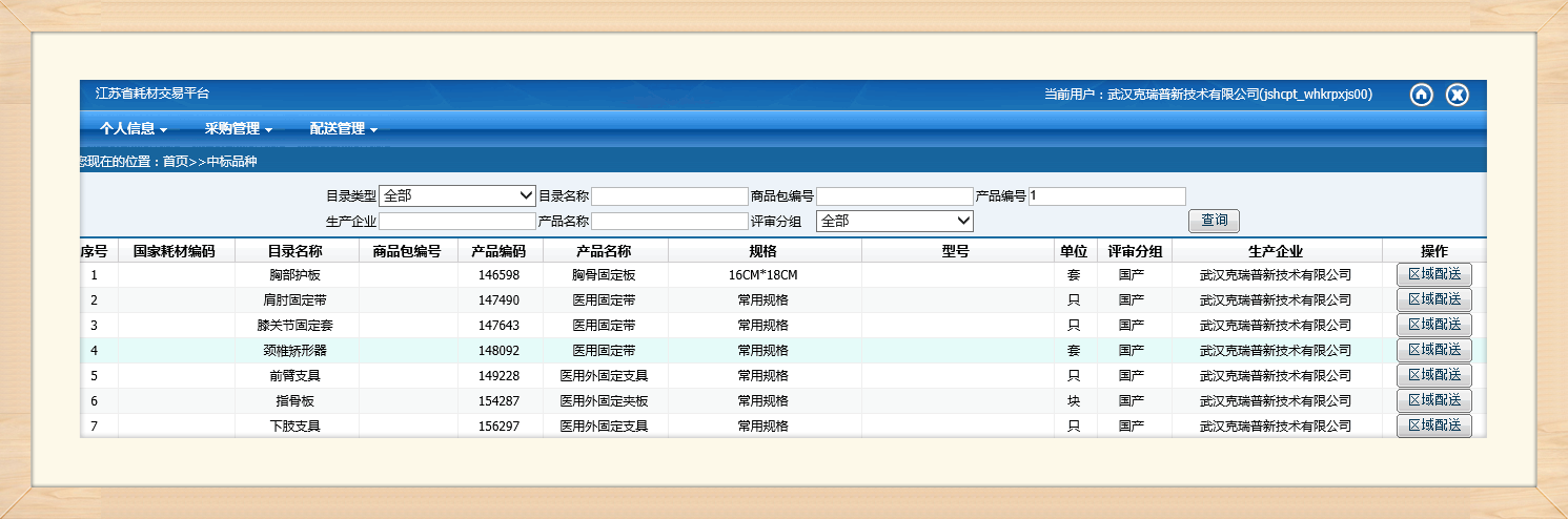 【江蘇省耗材交易平臺(tái)】我們武漢克瑞普公司產(chǎn)品:胸骨固定板、醫(yī)用外固定支具、醫(yī)用固定帶等產(chǎn)品已在江蘇省耗材交易平臺(tái)成功掛網(wǎng)中標(biāo),本次中標(biāo)的產(chǎn)品品種及規(guī)格較為多樣,這次中標(biāo)產(chǎn)品均為一類的骨科耗材產(chǎn)品與各大經(jīng)銷商已成功合作。