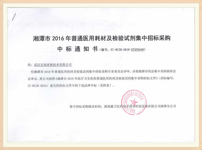 【湖南省湘潭市2016年普通醫(yī)用耗材及檢驗(yàn)劑集中招標(biāo)采購(gòu)中標(biāo)通知書】經(jīng)湘潭市2016年醫(yī)用耗材招標(biāo)采購(gòu)中經(jīng)專家評(píng)審,并報(bào)湘潭市藥品集中采購(gòu)聯(lián)席會(huì)審議我們武漢克瑞普新技術(shù)有限公司已經(jīng)成功中標(biāo),中標(biāo)的產(chǎn)品是胸腔固定夾板(A1型)已在多家醫(yī)院臨床使用使用反應(yīng)良好。