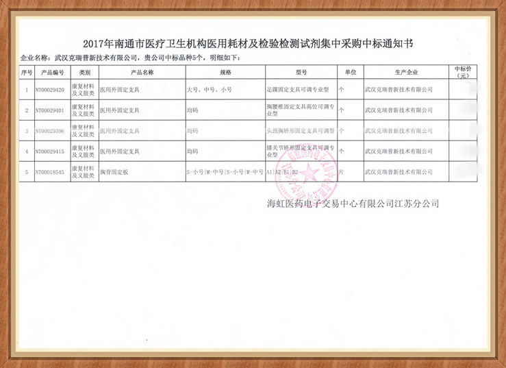 【江蘇省2017年南通市醫(yī)療衛(wèi)生機構(gòu)醫(yī)用耗材及檢驗測試劑集中采購中標(biāo)通知書】我們2017年在南通經(jīng)過我們招標(biāo)的同事辛苦的努力下在南通市衛(wèi)生機構(gòu)醫(yī)用耗材集中采購招標(biāo)項目中我們的東科圣康品牌醫(yī)用外固定支具以及由我們武漢克瑞普出品的胸骨固定板均成功中標(biāo),產(chǎn)品為一類的骨科外固定耗材,產(chǎn)品適用于胸外科、骨科、急診科、理療科、整形科、120急救等。