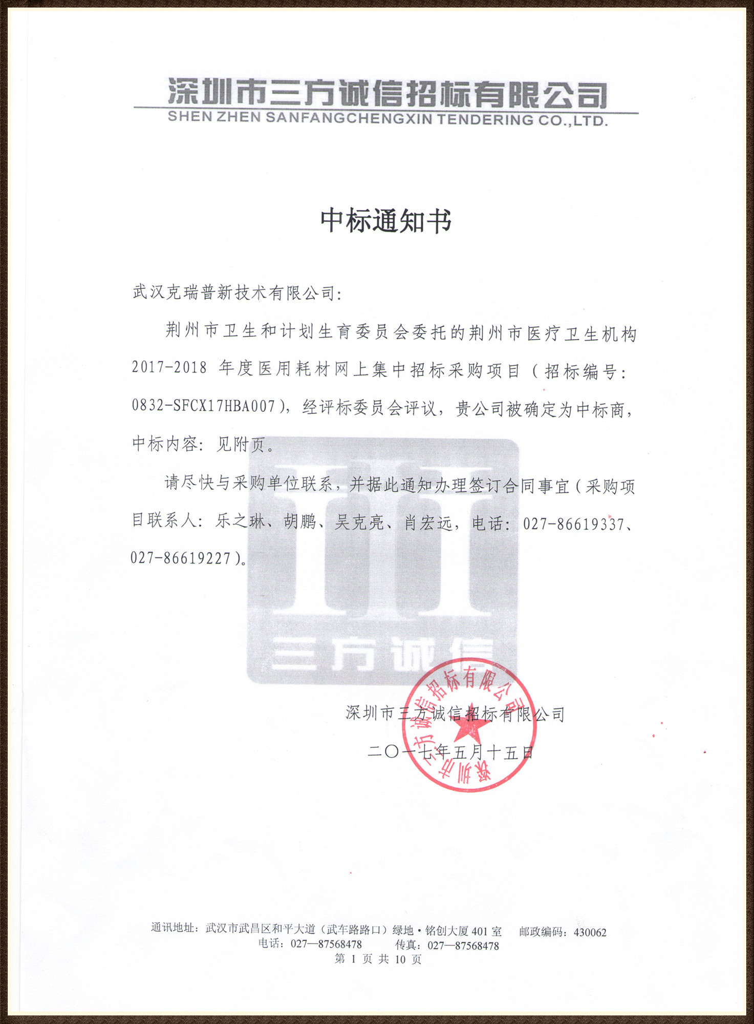【湖北省荊州市衛(wèi)生機(jī)構(gòu)2017-2018年度醫(yī)用耗材網(wǎng)上集中招標(biāo)采購項(xiàng)目中標(biāo)通知書】武漢克瑞普在2017-2018年度荊州市醫(yī)用耗材集中招標(biāo)采購項(xiàng)目中成功中標(biāo)了以下骨科耗材產(chǎn)品具體有:胸腔固定夾板、高分子固定繃帶、高分子固定夾板、醫(yī)用固定帶(種類包含多樣)、醫(yī)用外固定支具等骨科耗材在評標(biāo)委員會的評判下我司被確定為中標(biāo)商。