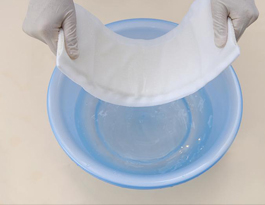 2、打開包裝袋,把東科圣康高分子夾板浸入常溫20℃-25℃水中約4-8秒鐘,同時(shí)用手?jǐn)D壓無紡棉,反復(fù)2-3次;