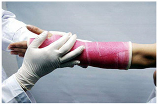 6、固定部位有皮外傷或需操作更長時(shí)間時(shí),夾板可先不浸水,直接用紗布繃帶或彈性繃帶纏繞固定后在薄外層的無紡布上噴灑水來加速硬化;